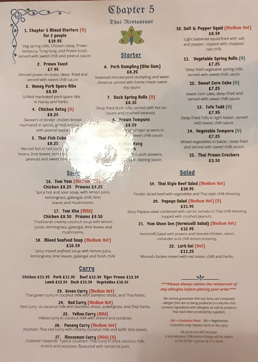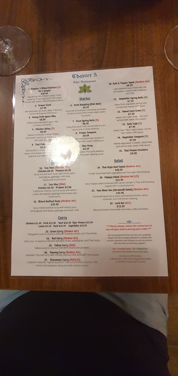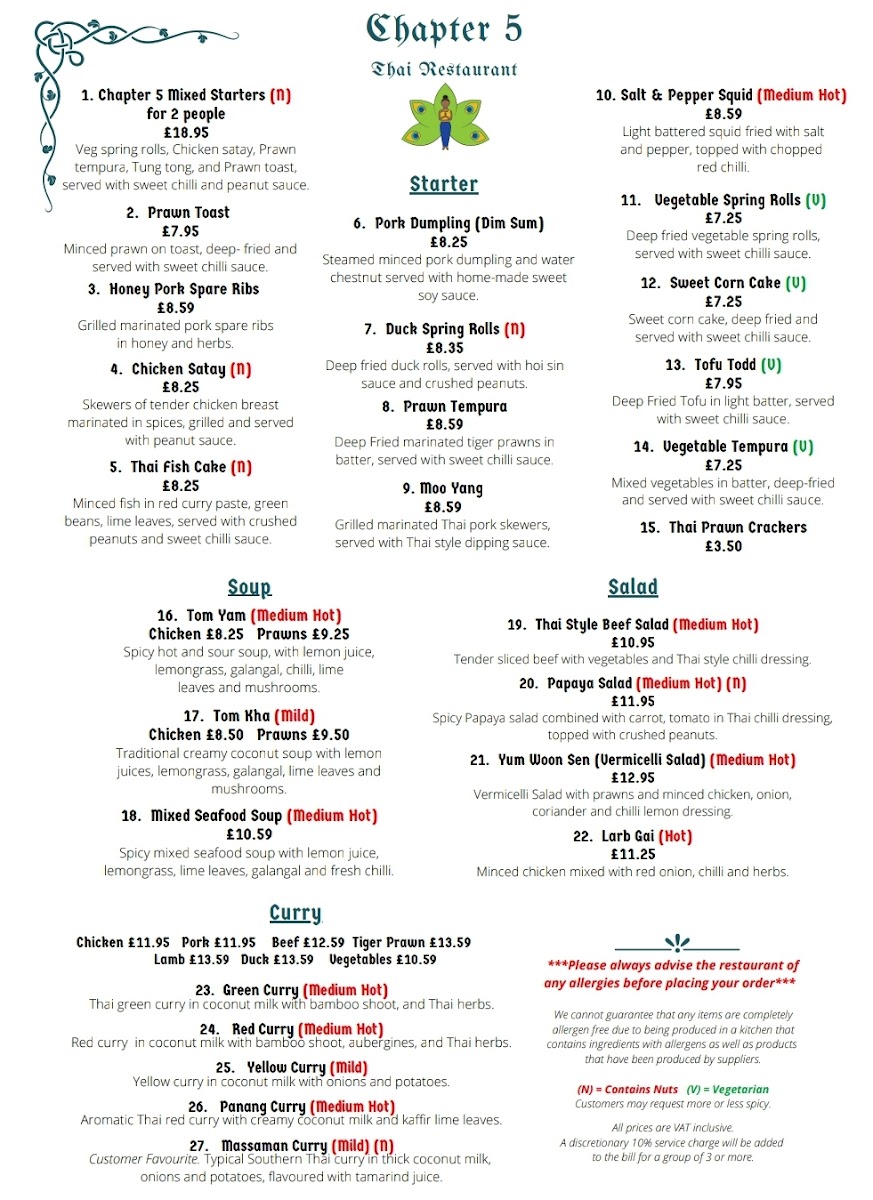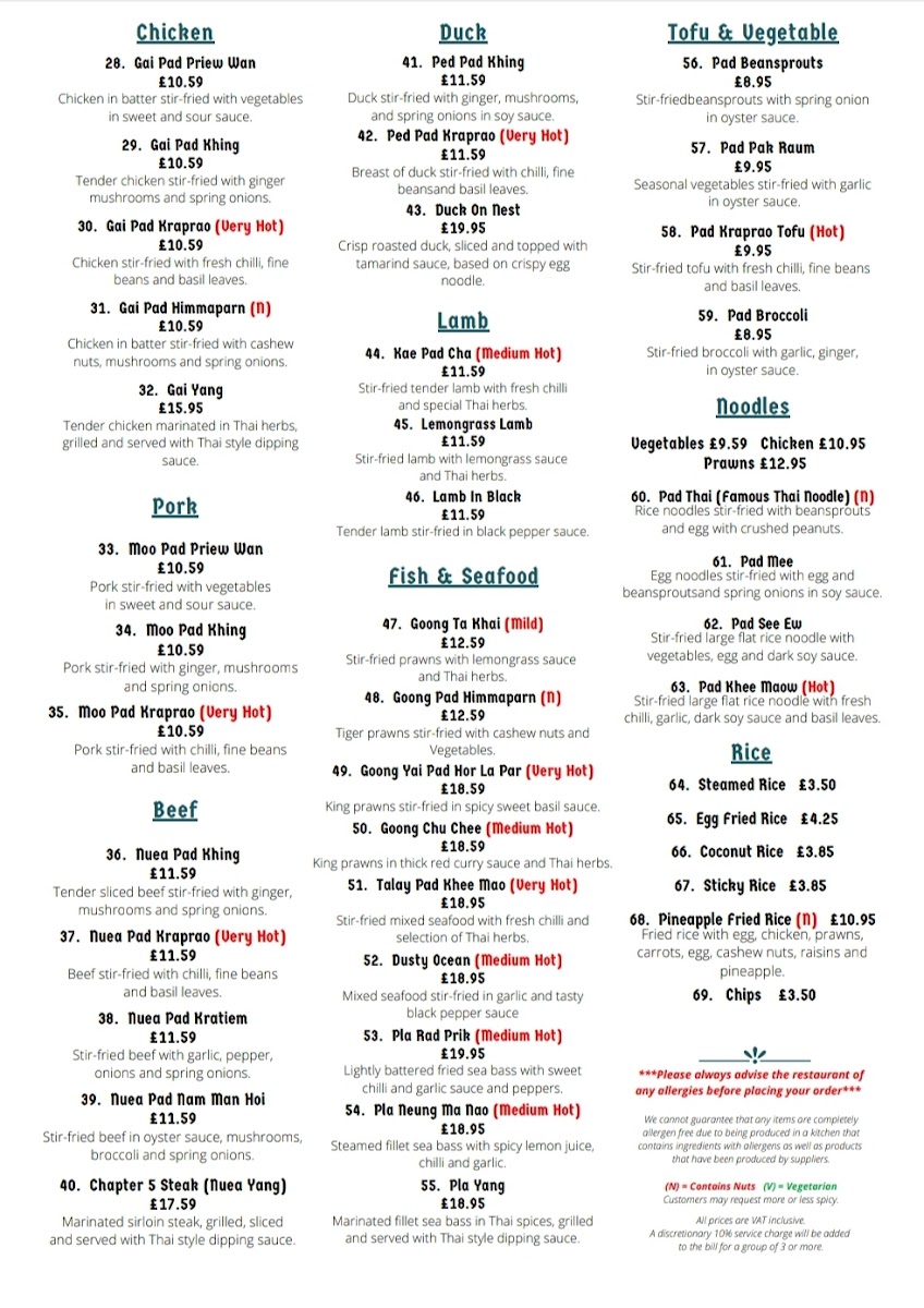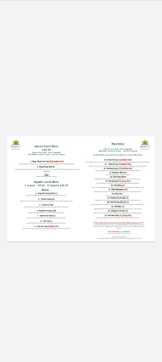 The menu at Chapter5 Thai Restaurant offers a thoughtfully curated selection that balances traditional Thai flavors with approachable, comforting dishes. Whether you’re looking for a light starter or a satisfying main course, the options range from vibrant salads and delicate dim sum to rich, aromatic curries and stir-fried noodles. The style leans toward casual dining, making it easy to enjoy a relaxed lunch or a cozy dinner.
